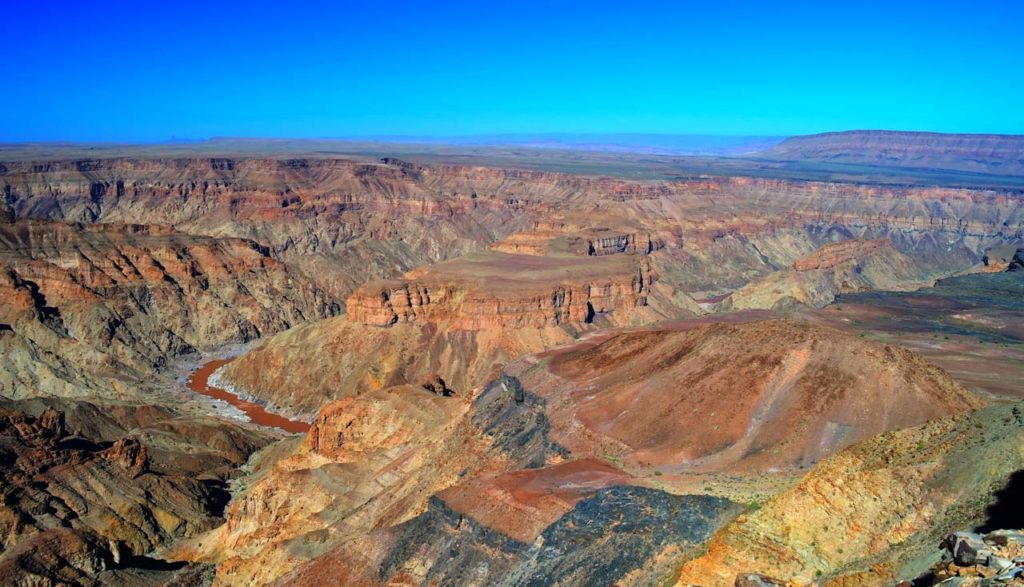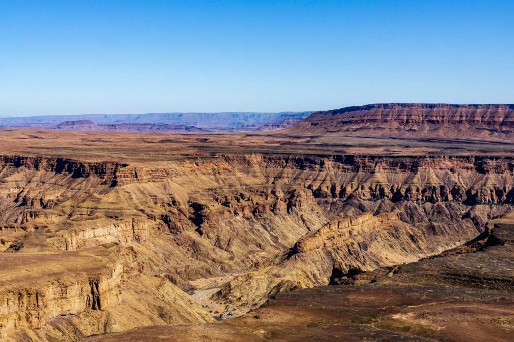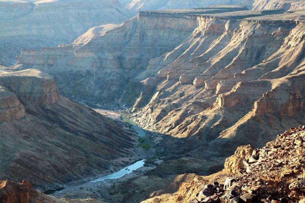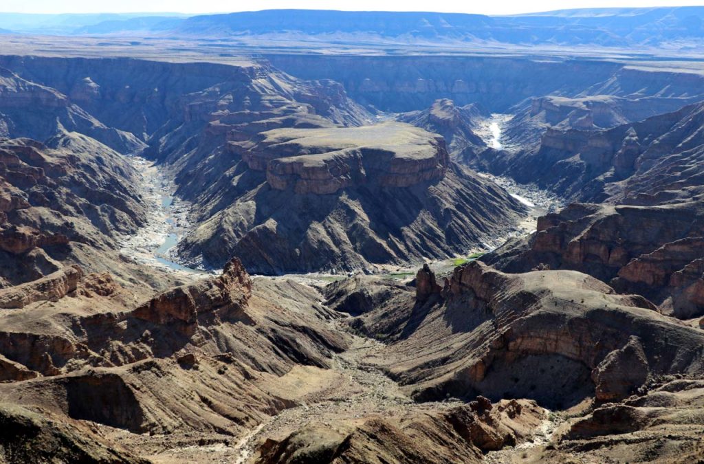 En plein désert de rocaille, une véritable cassure du haut plateau fait soudain plonger le regard le long de murailles sombres et vertigineuses au bas desquelles brille le filet vert de la Fish River. Ce canyon torturé (situé au sud de la Namibie), creusé par la rivière capricieuse sur une longueur de 161 km, avec des dénivelés de plus de 550 mètres de hauteur, cisaille le plateau aride en une faille spectaculaire, digne de son cousin, le Grand Canyon du Colorado aux Etats-Unis.