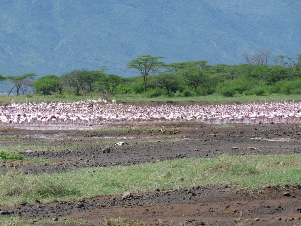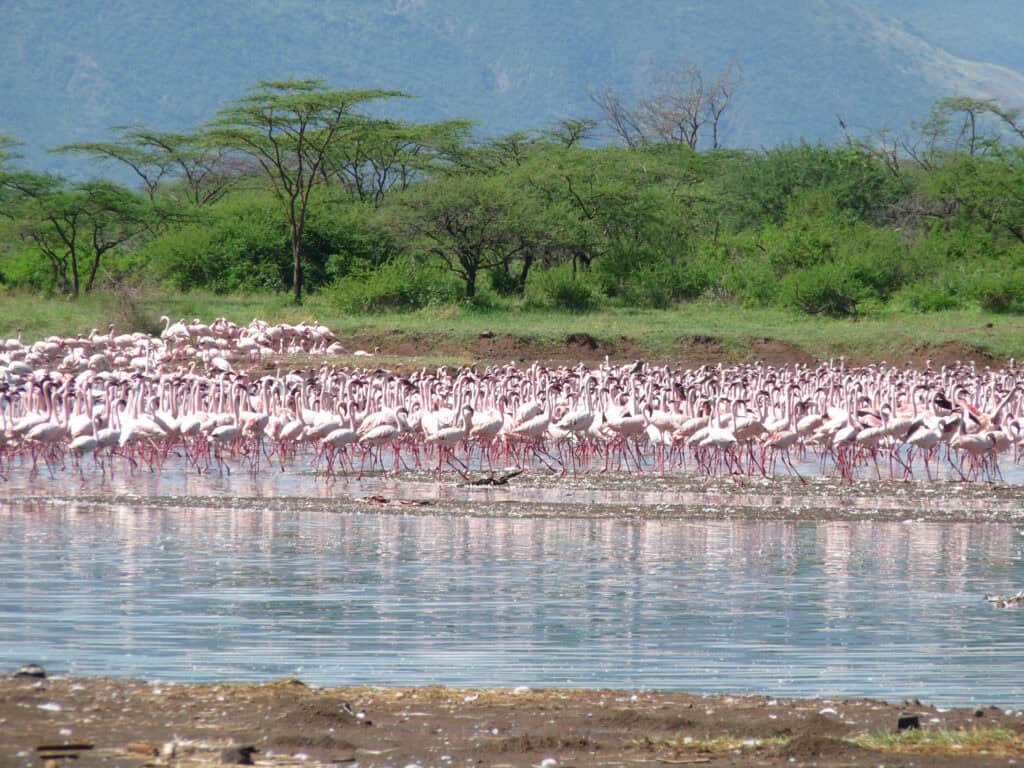 Celui-ci est un des lacs préférés des flamants roses (phoenicopterus minor) et l’endroit idéal pour venir admirer une population qui approche parfois le million d’individus. Selon les années, leur nombre et leur concentration sont maintenant bien plus spectaculaires qu’à Nakuru. Il est également renommé pour ses geysers d’eau chaude qui jaillissent à ras de terre. C’est là aussi, que l’on peut admirer les rares grands coudous, cette belle antilope aux immenses cornes torsadées (ainsi que des gazelles, des zèbres, des dik-diks et quelques buffles.)