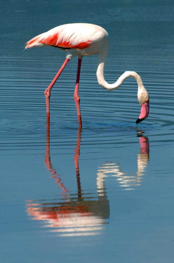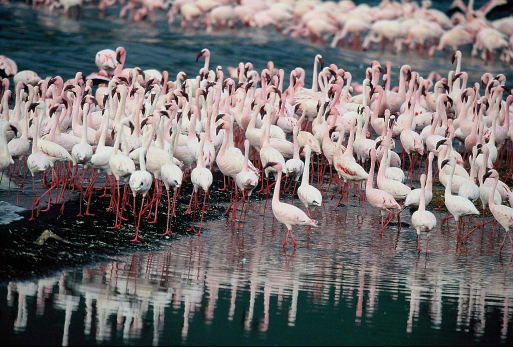 Rares sont les animaux qui comme eux, supportent la causticité de son eau, proche de celle de l’ammoniac. Par conséquent, personne ne peut s’y baigner. Les flamants roses ont donc peu de prédateurs, car, après une première barrière formée par la boue, ceux qui s’aventureraient dans le lac risqueraient la calcification. Lorsqu’il s’est rendu sur ses rives, le célèbre photographe animalier Nick Brandt a dû se rendre à l’évidence : il existe, en Afrique, un lac qui transforme les animaux en statue de pierre. Les femmes masaïs, drapées dans le shuka, le tissu rouge ou bleu de leur tenue traditionnelle, récoltent le sel et en font des plaques qu’elles revendent sur les bords des pistes. Un survol en avion, peut être fascinant, car en plus des taches roses des colonies de flamants, on peut observer des concrétions minérales rouges dans le lac. Attention, les abords sont dangereux en voiture du fait de la boue et de la croute asséchée et superficielle qui peut s’effondrer. Il est préférable d’y accéder à pied guidé par un masaÏ.