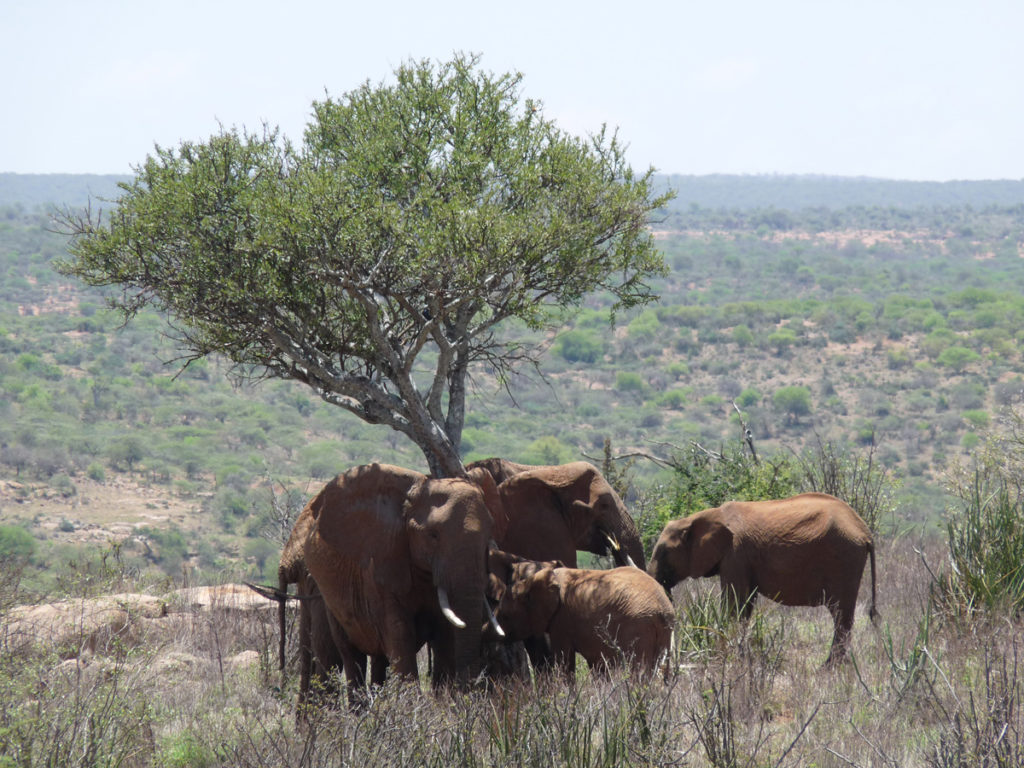 Quand nous avons atteint le fleuve Ewaso Ngiro, j’ai vu un spectacle inoubliable, des éléphants en grand nombre qui se baignent et se désaltèrent et des petits éléphanteaux joyeux qui jouent à se défier puis s’aspergent de boue. Quand les mères jugent qu’ils ont assez joué, elles les rappelent à l’ordre avec des mouvements de trompe. Je me suis amusé à compter les éléphants. Ils sont environ une centaine répartis en plusieurs groupes et je comprends qu’il y a un protocole qui régit leurs comportements. Il n’y a pas de désordre, chaque groupe attend son tour avant de profiter de l’eau. Quand ils ont fini, ils traversent le fleuve en prenant garde que les petits ne soient pas emportés par le courant. Nous sommes restés la plus grande partie de la matinée à l’ombre des palmiers Doum, à contempler ce spectacle. Le cadre est magnifique avec au loin les collines et les montagnes qui bordent Samburu.