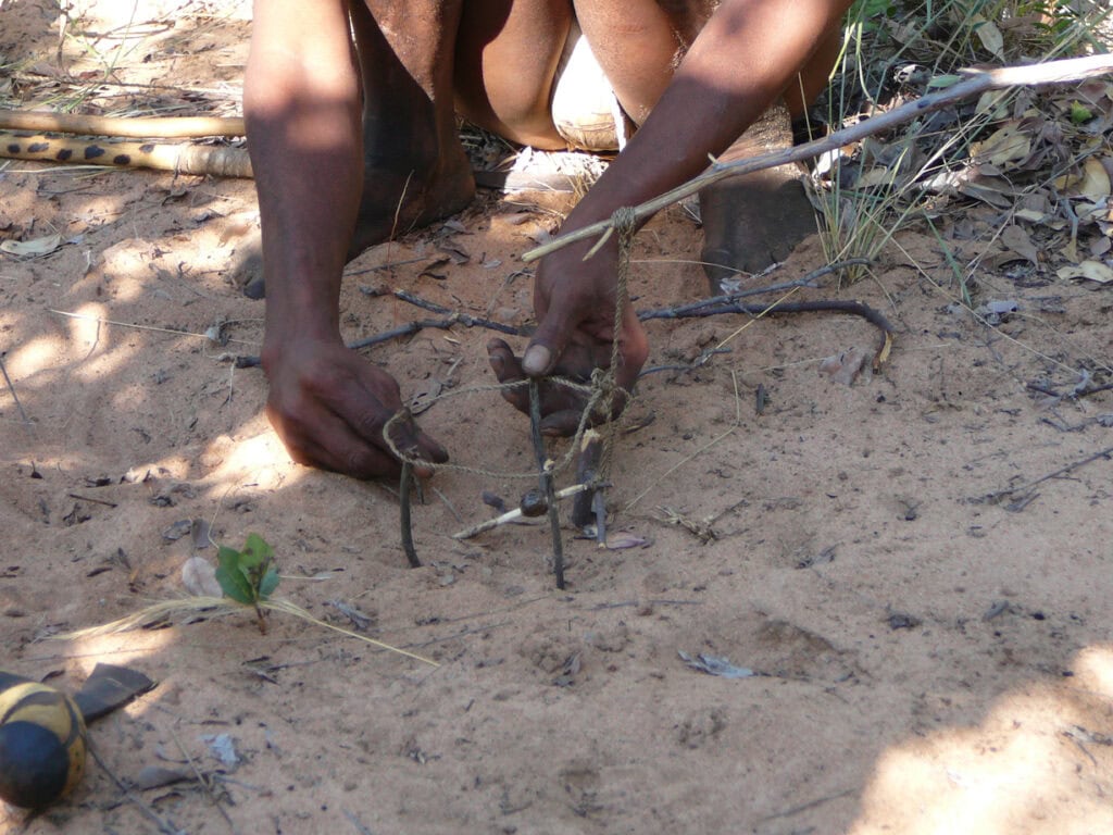 Les Bushmen enduisent leurs flèches d’un poison provenant de la larve d’un insecte « Diamphidia simplex ». Au milieu de l’été, l’insecte laisse ses œufs sur un arbuste de la famille des commiphores : lorsque les larves éclosent, elles se nourrissent de ses feuilles. Puis les larves tombent sur le sol avant de s’enfouir dans un cocon, entre 20 cm et 30 cm sous la surface de la terre. Dès la fin de l’été, les Bushmen collectent les cocons afin d’en extraire la substance toxique. Les cocons sont soit stockés dans des petits récipients protégés par du coton sauvage, soit ouverts et vidés de leur liquide blanchâtre qui sera immédiatement déposé avec grande précaution sur le bois de la flèche, juste en dessous de la pointe. Huit à dix larves sont nécessaires pour que le poison appliqué sur une flèche soit fatal. Préservé à l’intérieur du cocon, le poison garde sa valeur toxique pendant plus de trois mois. Ne connaissant pas d’antidotes à ce poison, les Bushmen prennent de grandes précautions lorsqu’ils manipulent les larves et les flèches enduites de liquide.
