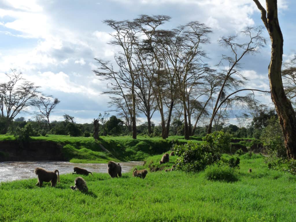Quand nous avons atteint le fleuve Ewaso Ngiro, j’ai vu un spectacle inoubliable, des éléphants en grand nombre qui se baignent et se désaltèrent et des petits éléphanteaux joyeux qui jouent à se défier puis s’aspergent de boue. Quand les mères jugent qu’ils ont assez joué, elles les rappelent à l’ordre avec des mouvements de trompe. Je me suis amusé à compter les éléphants. Ils sont environ une centaine répartis en plusieurs groupes et je comprends qu’il y a un protocole qui régit leurs comportements. Il n’y a pas de désordre, chaque groupe attend son tour avant de profiter de l’eau. Quand ils ont fini, ils traversent le fleuve en prenant garde que les petits ne soient pas emportés par le courant. Nous sommes restés la plus grande partie de la matinée à l’ombre des palmiers Doum, à contempler ce spectacle. Le cadre est magnifique avec au loin les collines et les montagnes qui bordent Samburu.