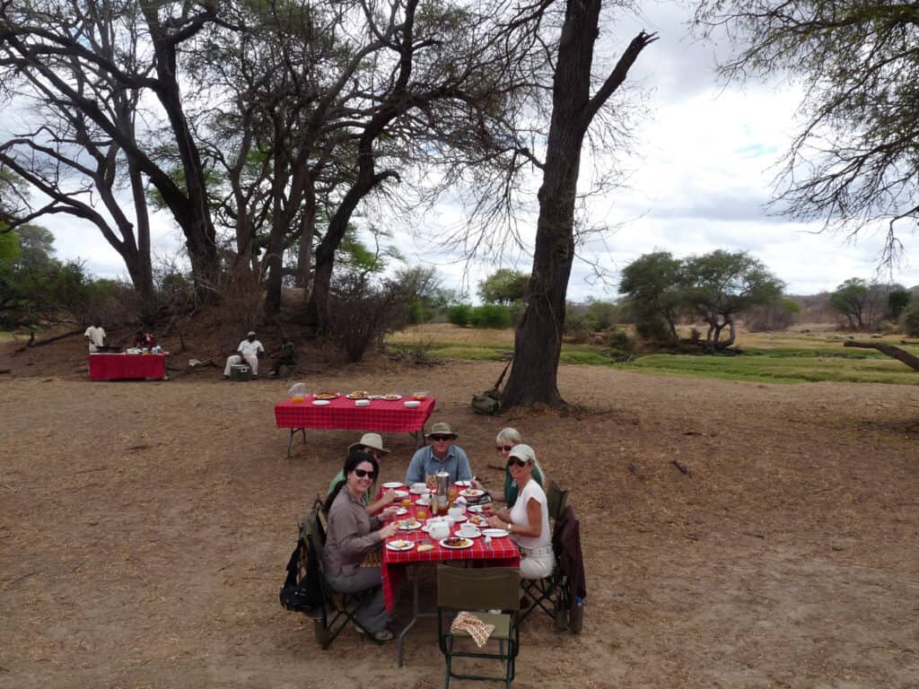 Les oiseaux chantent et se répondent, sans cacophonie. Chacun joue sa partition et ce chant enfle au fur et à mesure que le soleil monte. Un peu plus loin j’aperçois Mbaga, notre maître d’hôtel, qui met la dernière main à l’installation de la table du breakfast dans le mess.