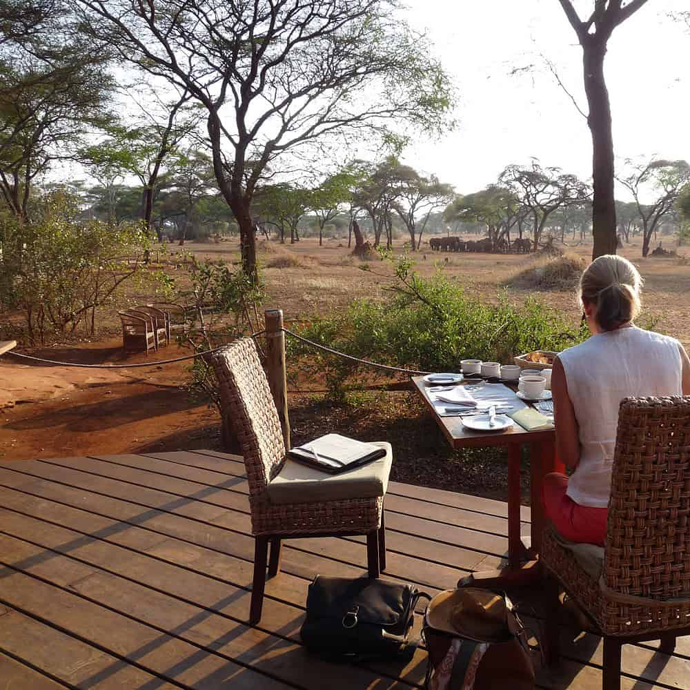 Les oiseaux chantent et se répondent, sans cacophonie. Chacun joue sa partition et ce chant enfle au fur et à mesure que le soleil monte. Un peu plus loin j’aperçois Mbaga, notre maître d’hôtel, qui met la dernière main à l’installation de la table du breakfast dans le mess.